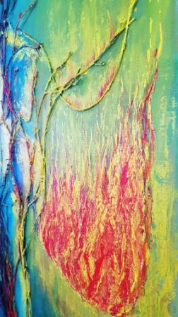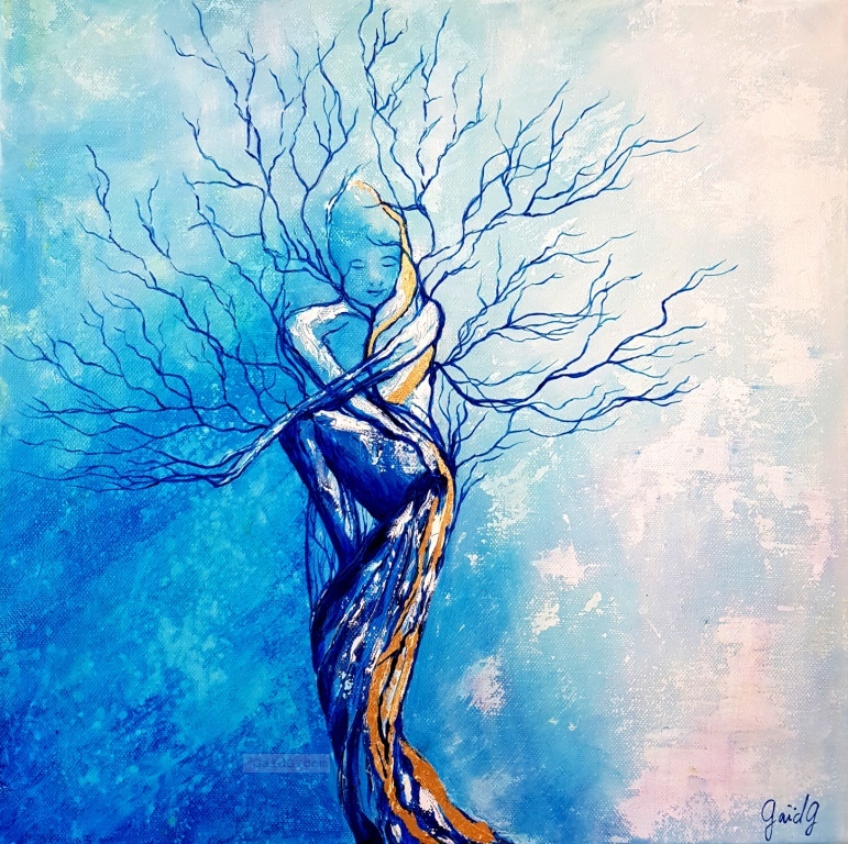La silhouette de femme qui m’a inspiré cette toile était une silhouette de danseuse très gracile, et je l’ai transformée en tronc avec des racines solides, ancrées dans le sol, permettant à la femme arbre de grandir doucement mais sûrement, avec force et sérénité. Et surtout ces racines permettent le développement des branches vers la lumière ! Une audace nécessitant un ancrage sérieux et profond que je souhaite à tout le monde.