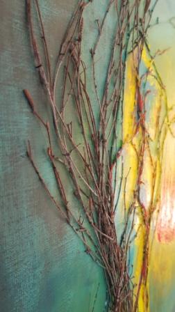 La toile, peinte en partie au couteau à l’acrylique, est agrémentée de banches d’arbre cousues à la toile et accompagnant le mouvement de la silhouette.