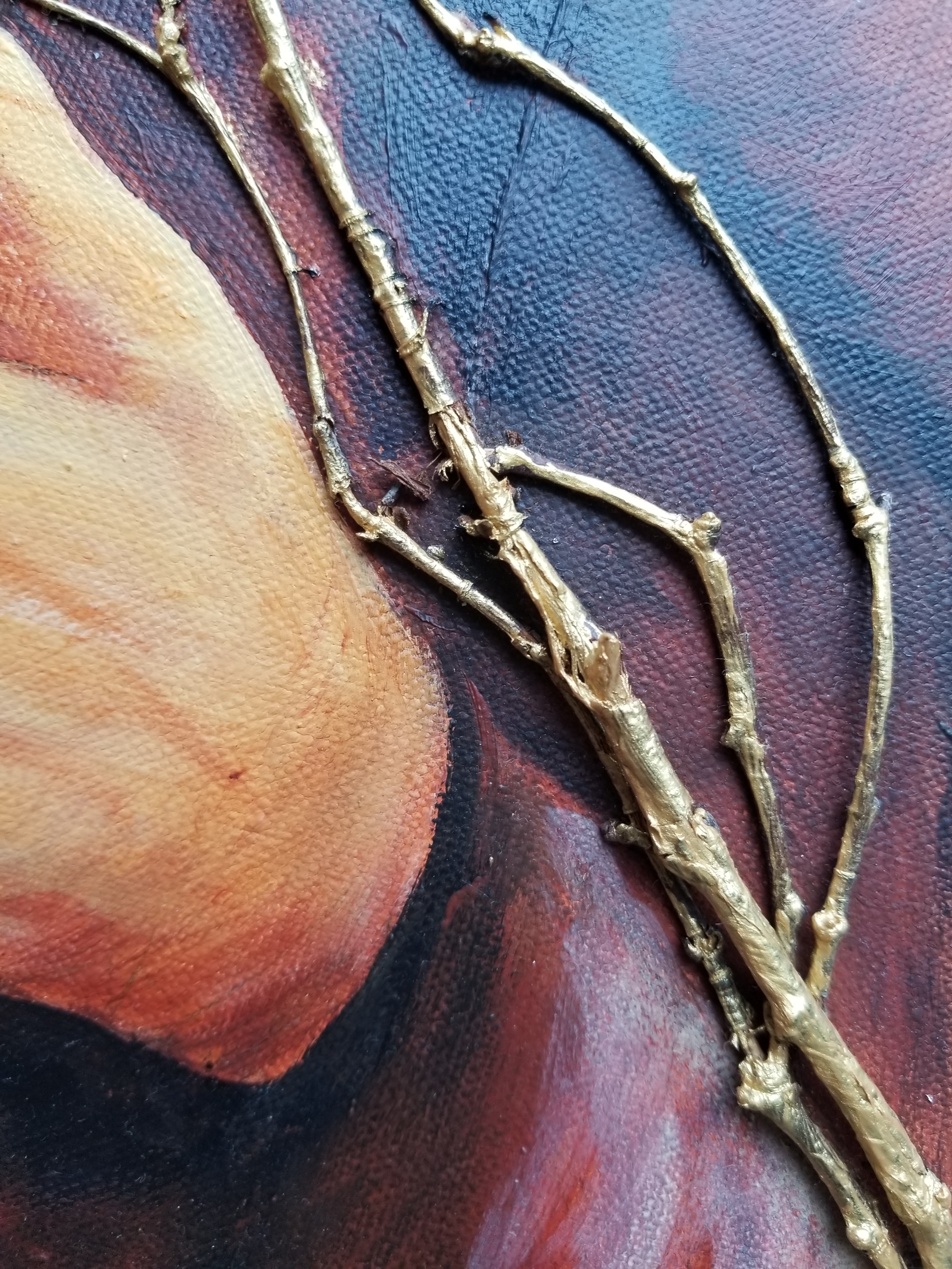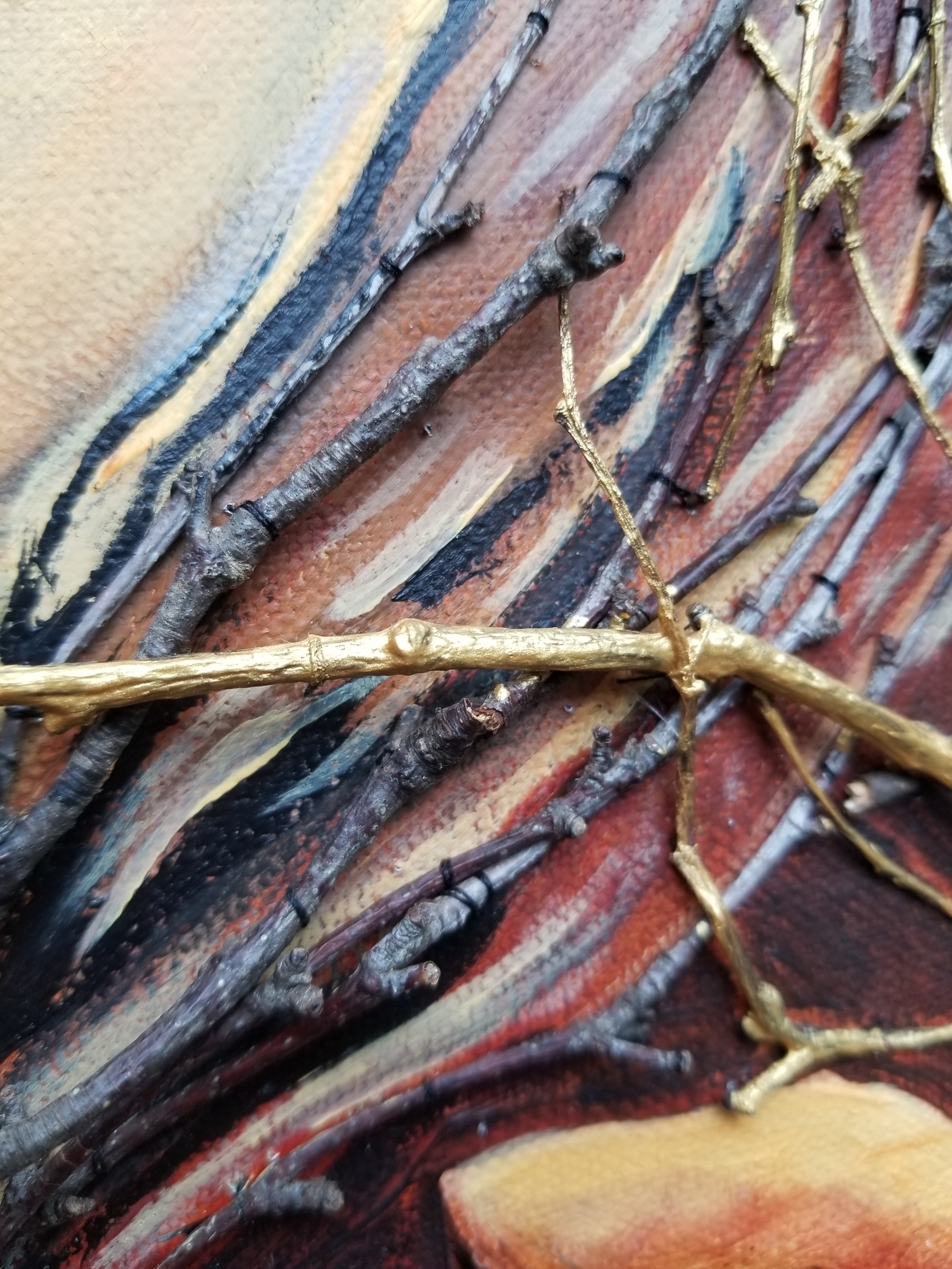 This artwork has been livened up with enveloping branches fixed on the canvas to go along with this slow and intense move.