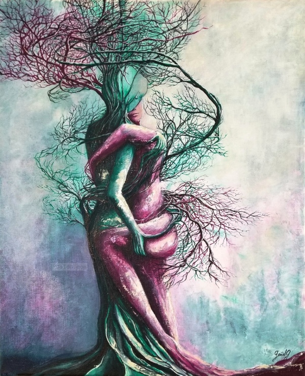 Bonjour à tous, Cette œuvre fait partie de la série « Humanité Végétale ». Elle est basée sur les silhouettes de deux danseurs de tango transformées en arbres – le mouvement des corps est notamment souligné par le tournoiement des branches… Cette toile sera présentée à Chatou le week-end prochain – Avis aux amateurs !