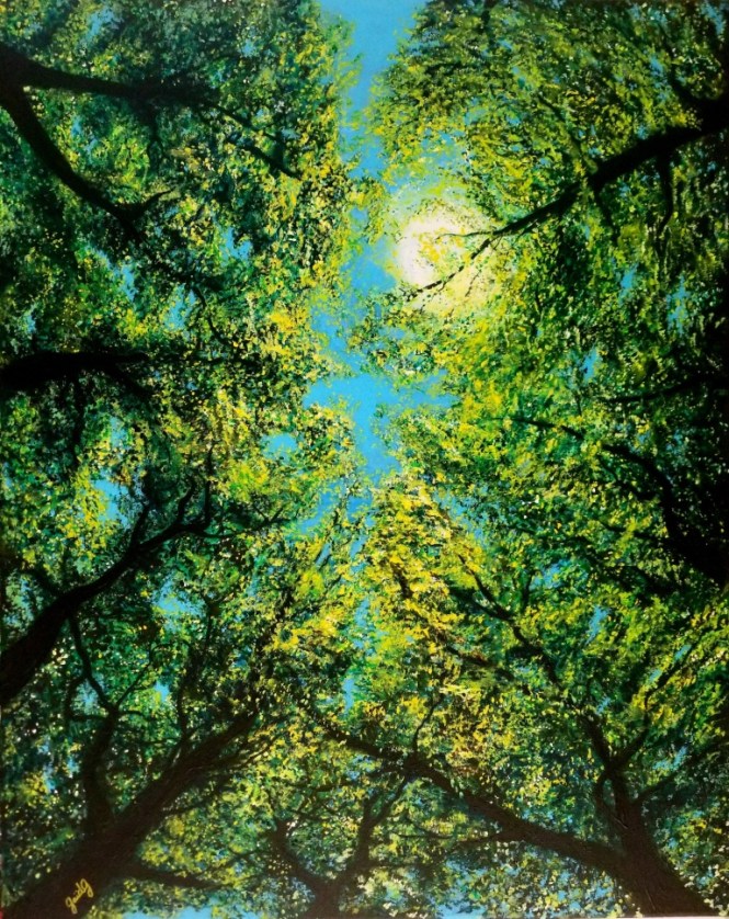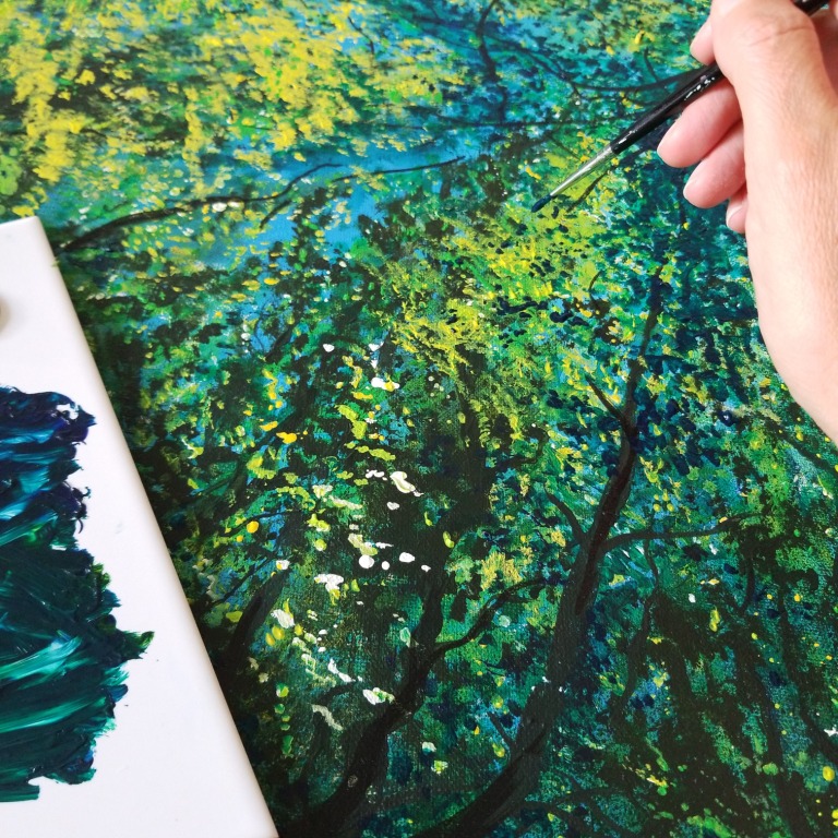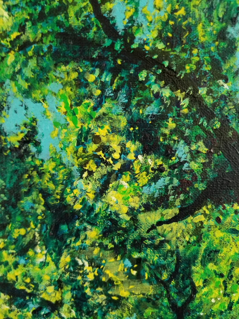 Cette peinture a pris du temps de confection et d’hésitations. J’ai en effet passé énormément de temps à faire des feuillages de toutes sortes de nuances de vert, de bleu et de violet, puis j’ai ajouté des points de lumière avec des touches de jaune et de blanc…. mais j’ai passé ensuite énormément de temps à me demander ce qui clochait !